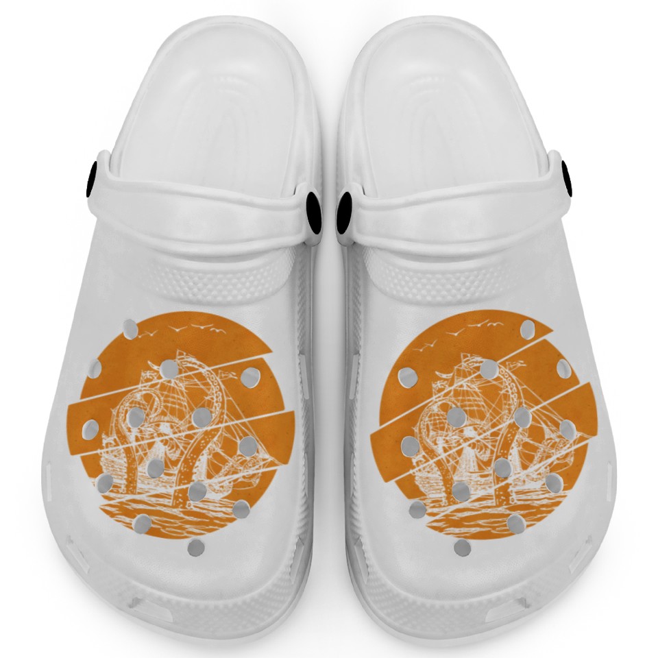 You're taking a peek at the product Vintage Kraken Pirate Ship Giant Octopus Ocean Clogs For Kids WHITE belong theme Clogs at Printblur