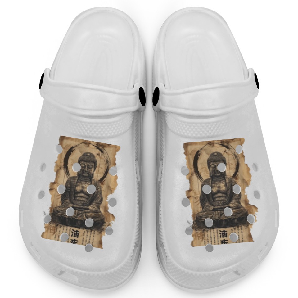 You are seeing a unique and impressive product Vintage Papyrus Scroll Japanese Silhouette Buddha Clogs For Kids WHITE belong theme Clogs at Printblur