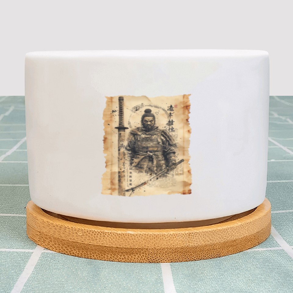 You're taking a peek at the product Vintage Papyrus Scroll Japanese Silhouette Samurai Plant Pots For WHITE belong theme Plant Pots at Printblur