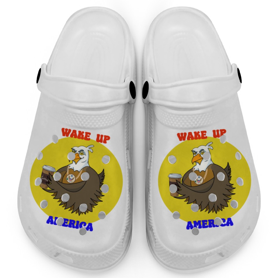 You are viewing one of the trendiest products Wake Up America - Bald Eagle Drinking Coffee Clogs For Kids WHITE belong theme Clogs at Printblur