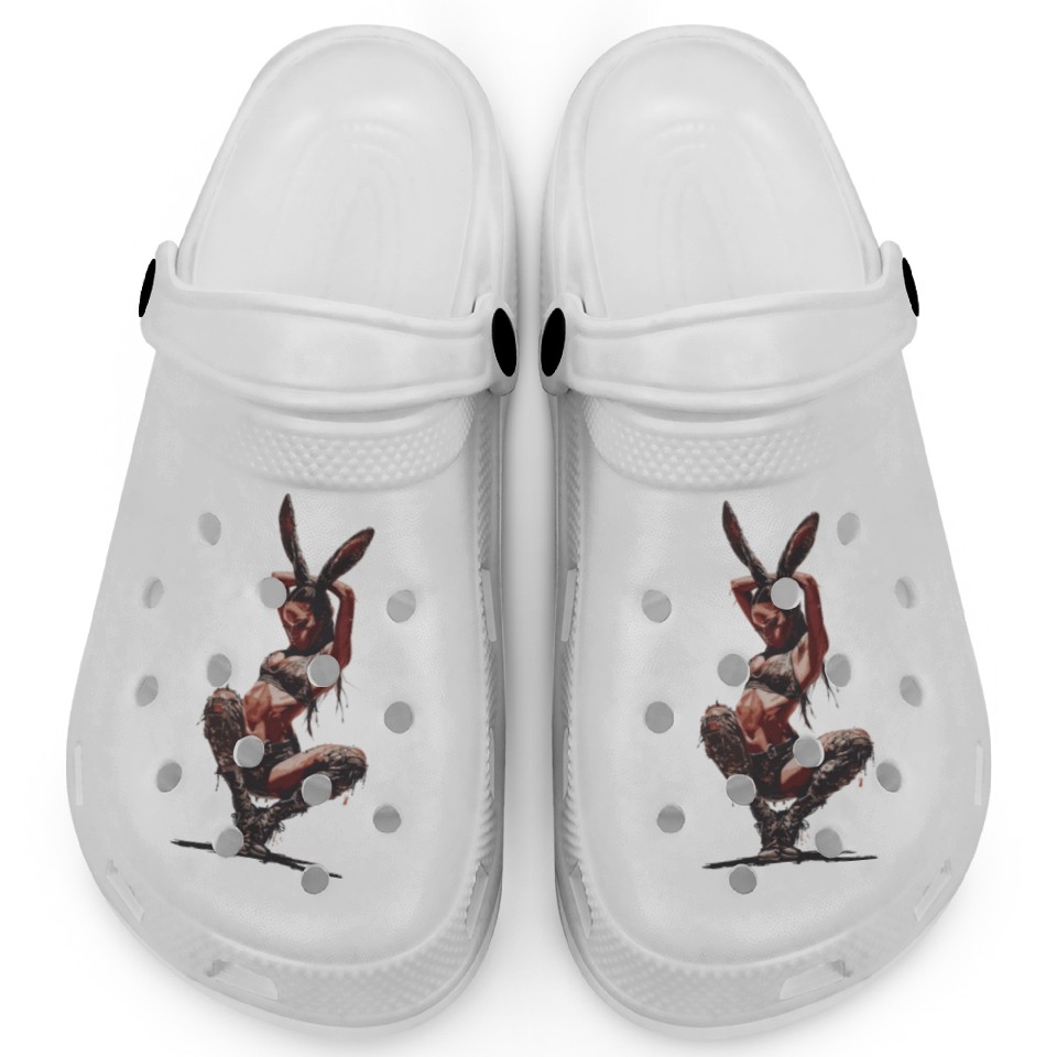 The product unique design you searched for is Warrior Bunny Ears Fantasy Art Powerful Pose Clogs For Kids WHITE belong theme Clogs at Printblur