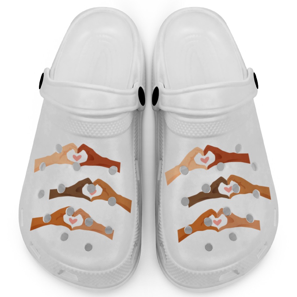 The item hot trend you're looking at is Watercolor Multi Hands Making Hearts Clogs For Kids WHITE belong theme Clogs at Printblur