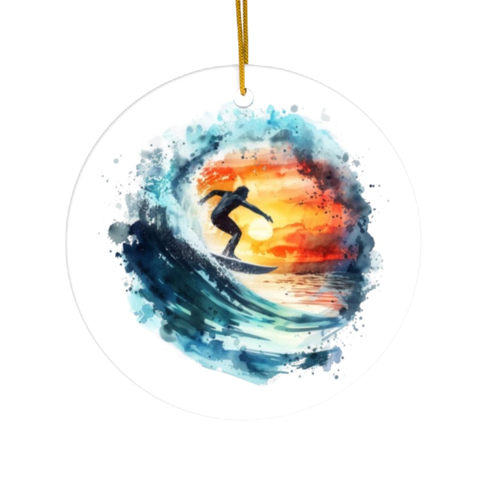 The item hot trend you're looking at is Watercolor Sunset Surfing Clipart | Surfboard, Ceramic Ornaments For WHITE belong theme Ceramic Ornaments at Printblur
