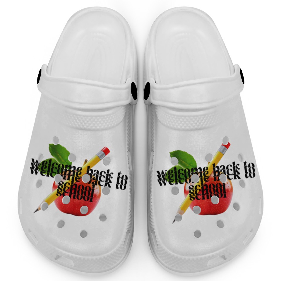 Own fascinating "Welcome Back to School - Red Apple and Yellow Pen Clogs or see more Clogs products now from Printblur shop to enjoy your shopping time!