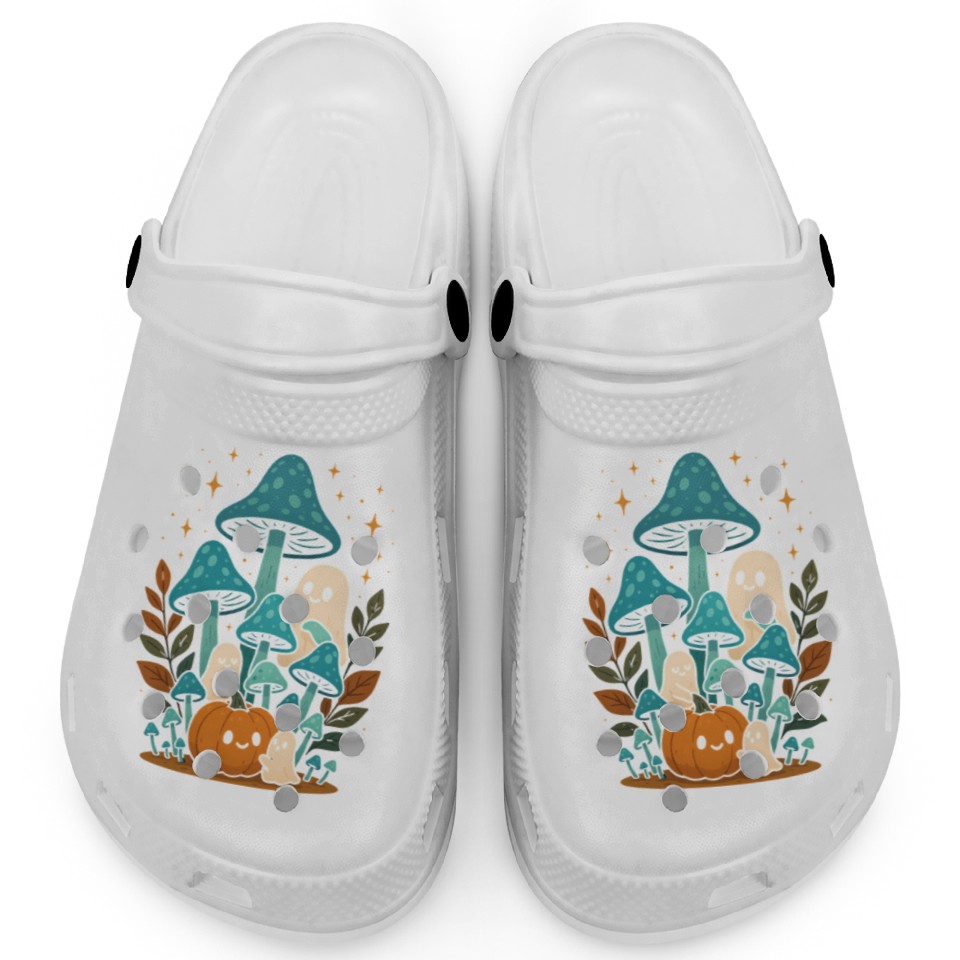 Whimsical Ghost and Mushroom Halloween Scene Clogs