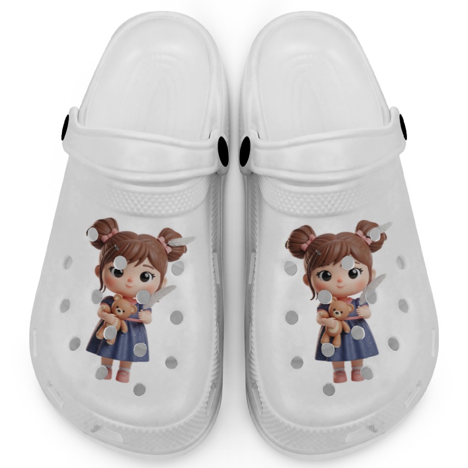 You are shopping for a stunning and trendy product Whimsical Girl with Feather and Teddy Bear Clogs For Kids WHITE belong theme Clogs at Printblur