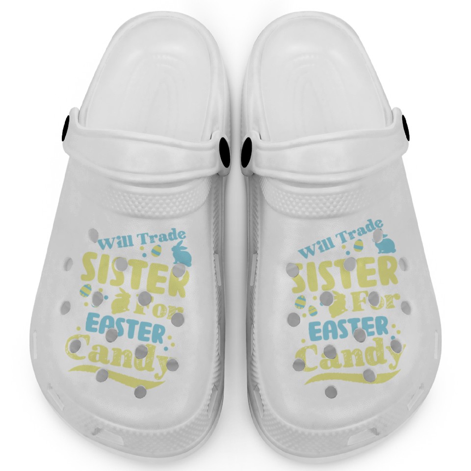 You're looking at the eye-catching product Will Trade Sister For Easter Candy Clogs For Kids WHITE belong theme Clogs at Printblur
