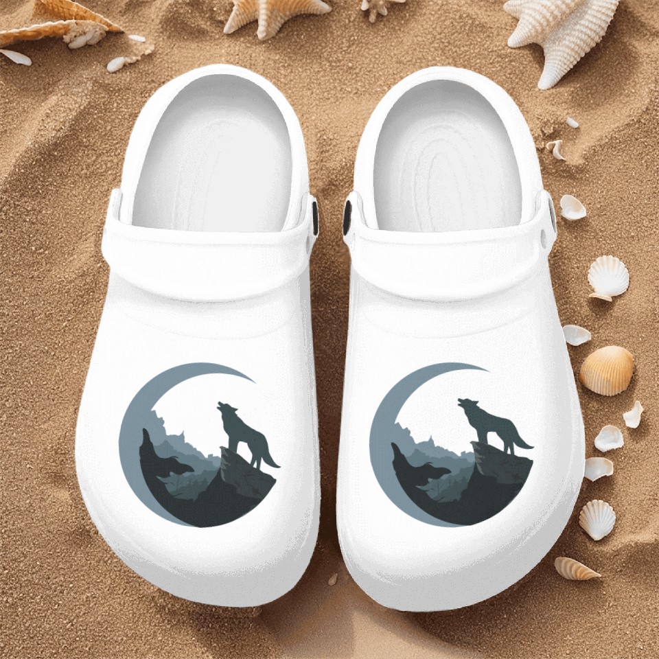 The product unique design you searched for is Wolf Moon Silhouette Nurse Clogs For Men WHITE belong theme Nurse Clogs at Printblur