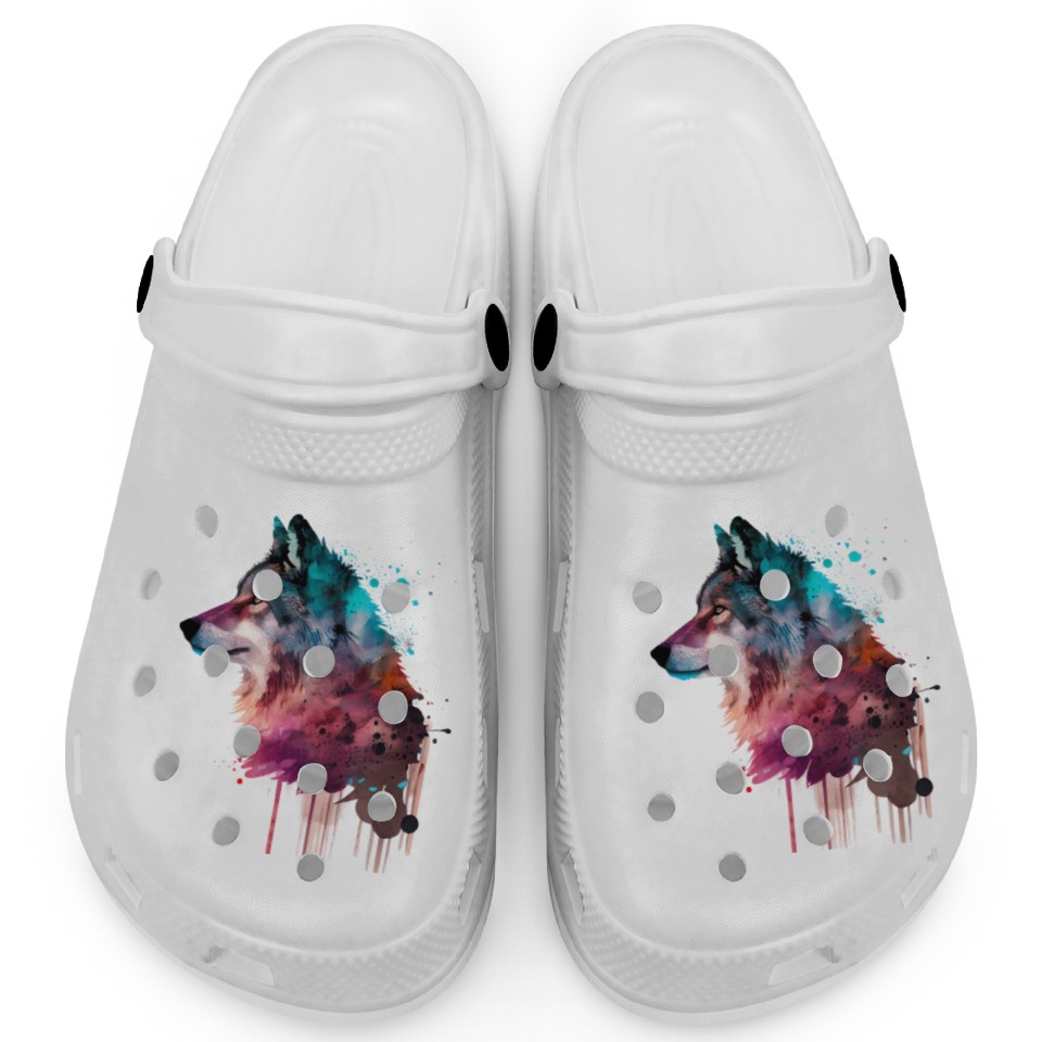 Buy eye-catching Wolf Multicolor Watercolor Portrait Clogs or see more Clogs products at Printblur shop now to explore many surprises from our shop!
