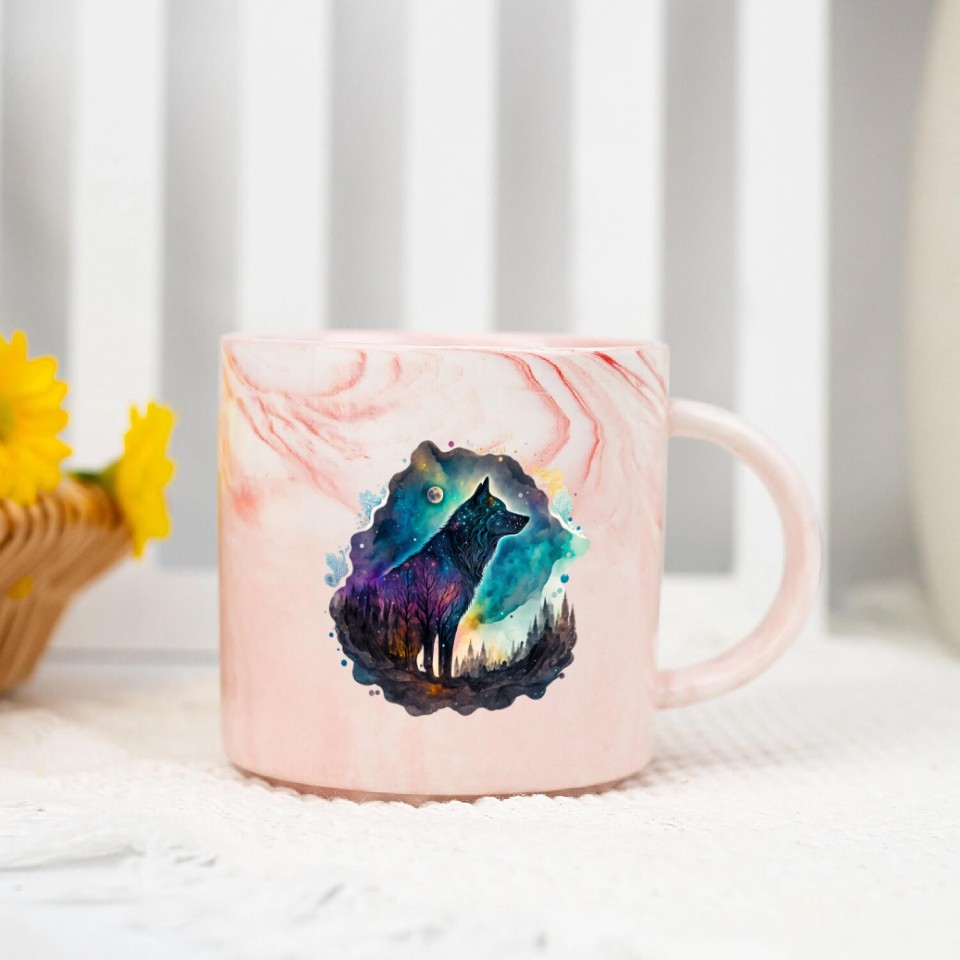 You are seeing a unique and impressive product Wolf Print, Cosmic Wolves, Animal Print, Cosmos Marble Mugs For Pink belong theme Marble Mugs at Printblur