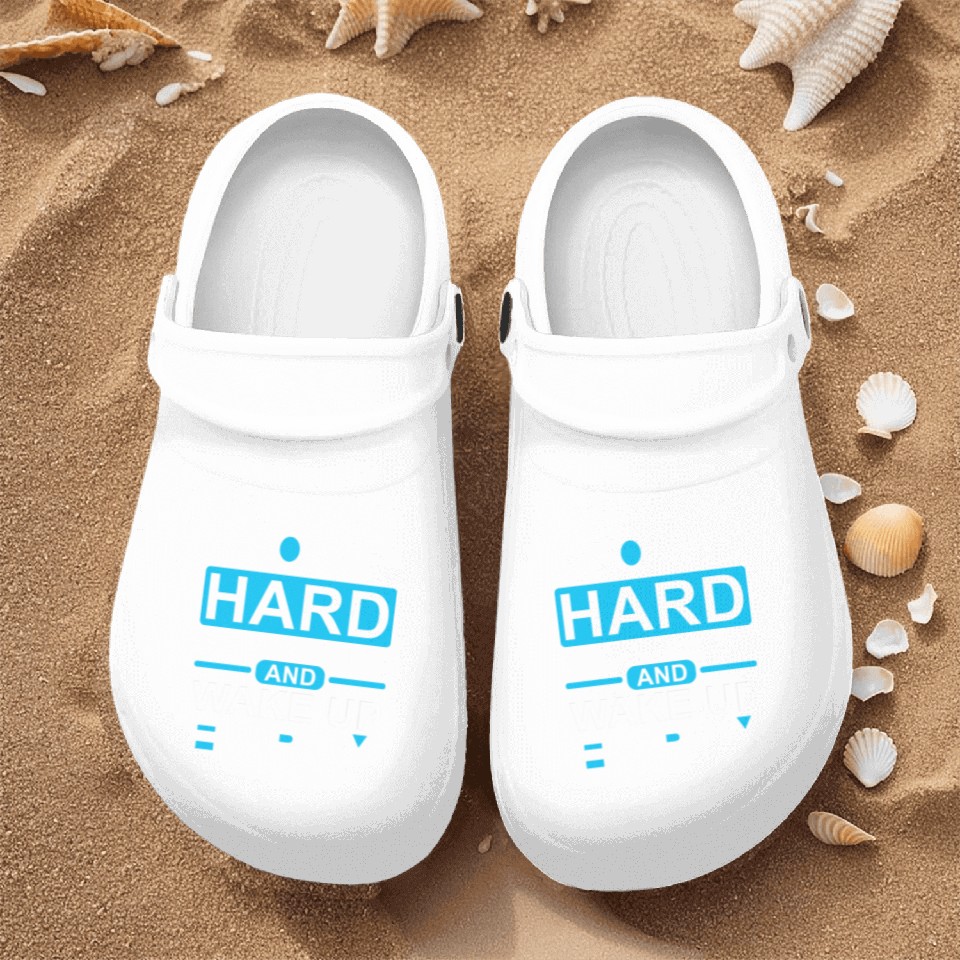 You're looking at the eye-catching product Work Hard Stay Positive Wake Up Early Nurse Clogs For Men WHITE belong theme Nurse Clogs at Printblur