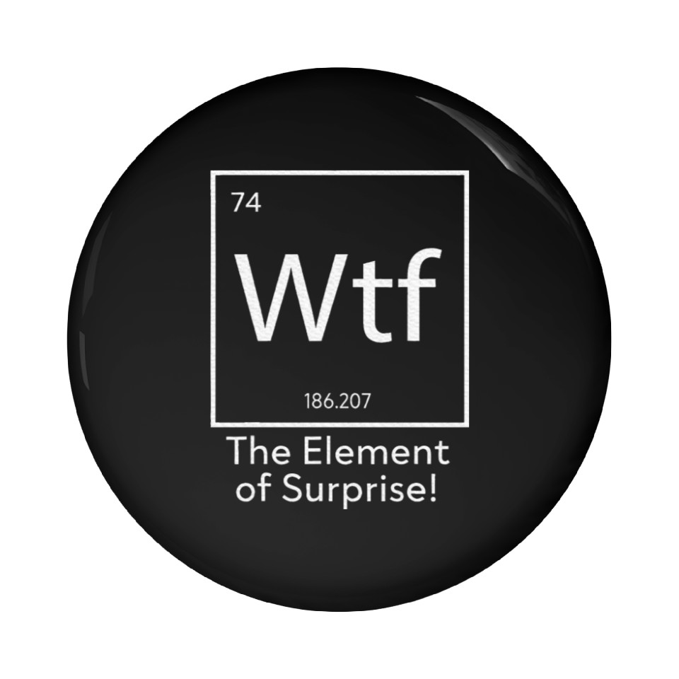 Own fascinating WTF The Element of Surprise Funny Science Pin Buttons or see more Pin Buttons products now from Printblur shop to enjoy your shopping time!