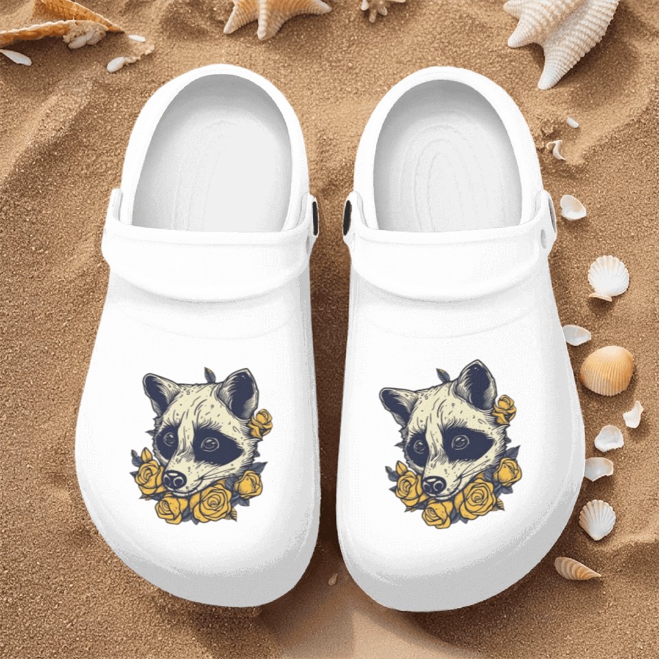 You are viewing an exclusive and elegant product Yellow Flower Raccoon Nurse Clogs For Men WHITE belong theme Nurse Clogs at Printblur
