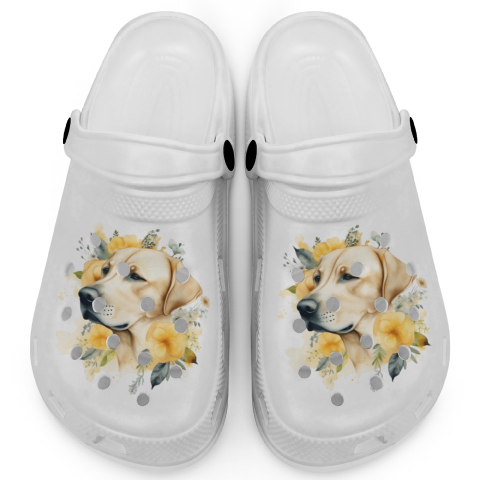 You're looking at the eye-catching product Yellow Lab Dog Watercolor Floral Clogs For Kids WHITE belong theme Clogs at Printblur