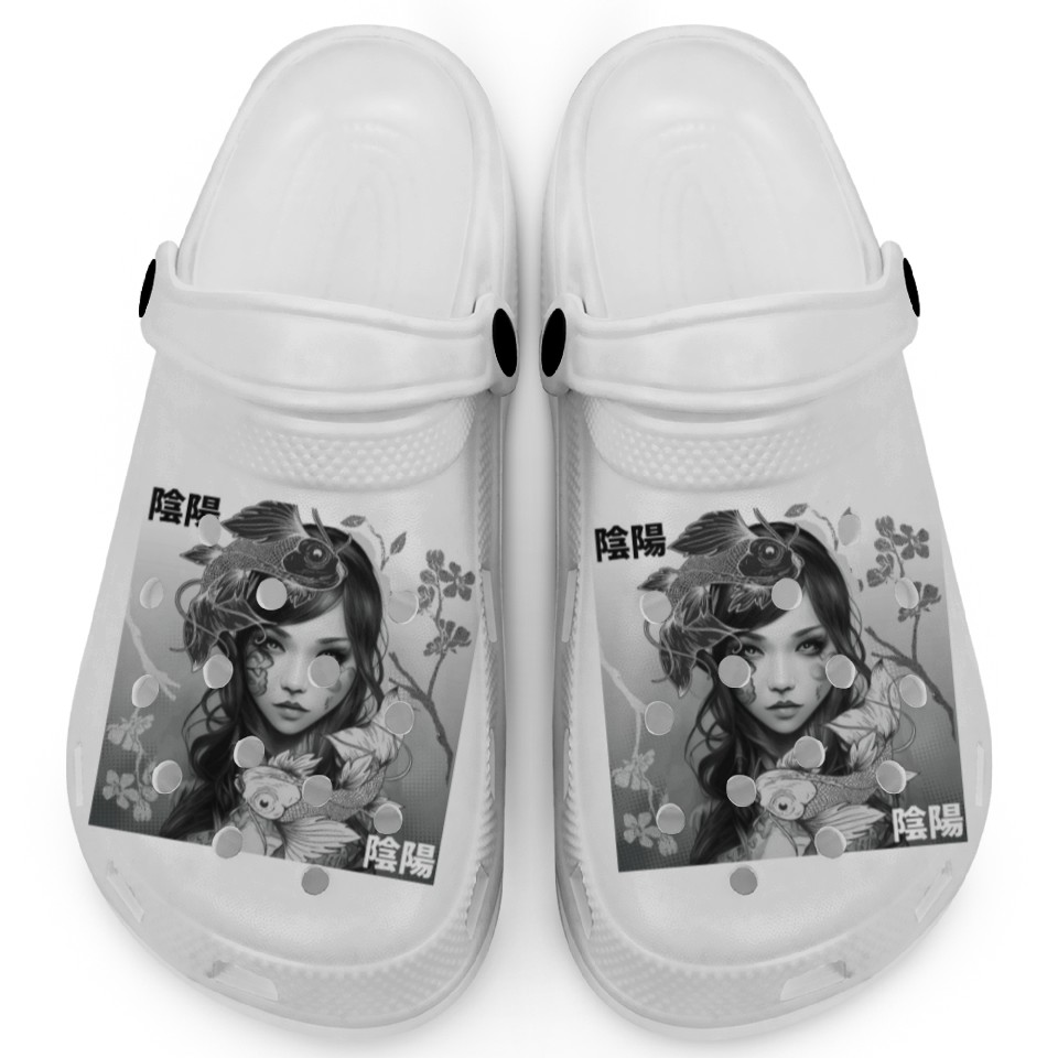You're taking a peek at the product Yin Yang Koi Fish Gothic Emo Japanese Cherry Bloss Clogs For Kids WHITE belong theme Clogs at Printblur