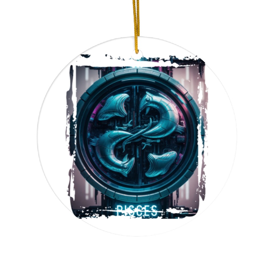 You are shopping for a stunning and trendy product Zodiac sign Pisces in cyberpunk era Future Ceramic Ornaments For WHITE belong theme Ceramic Ornaments at Printblur